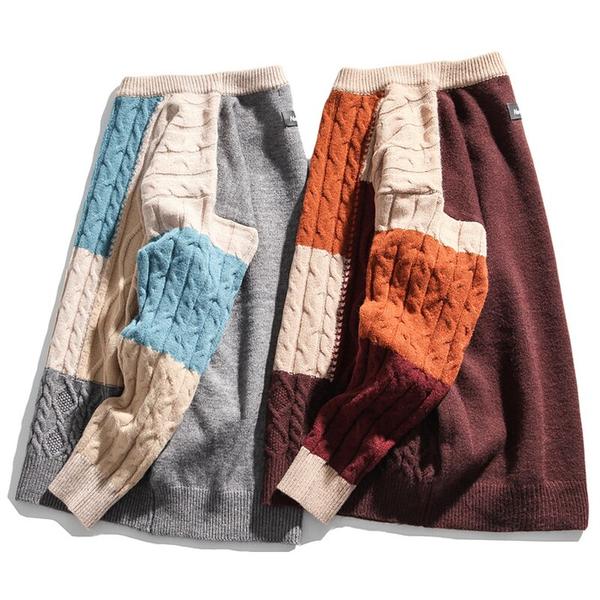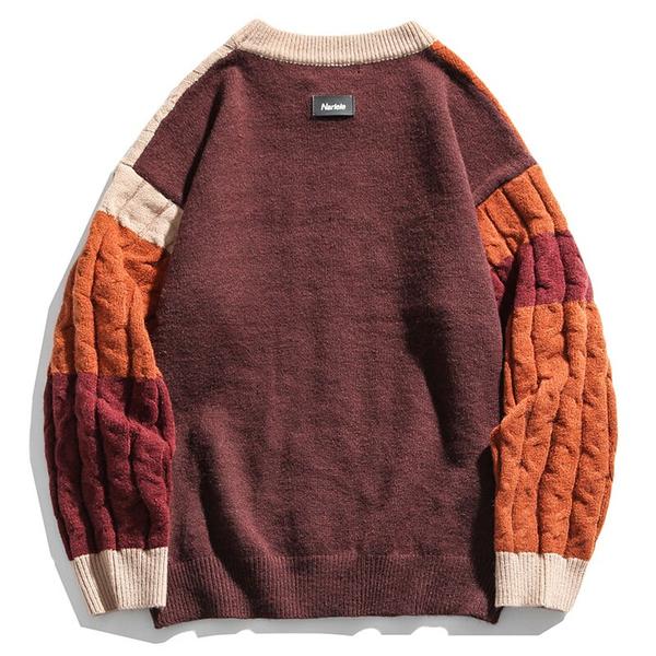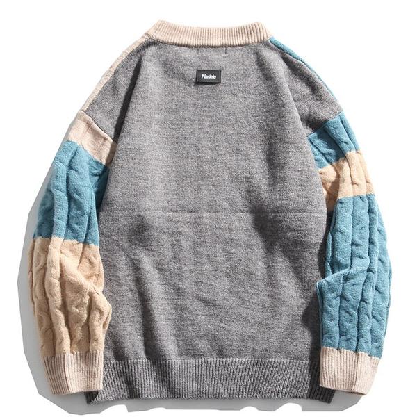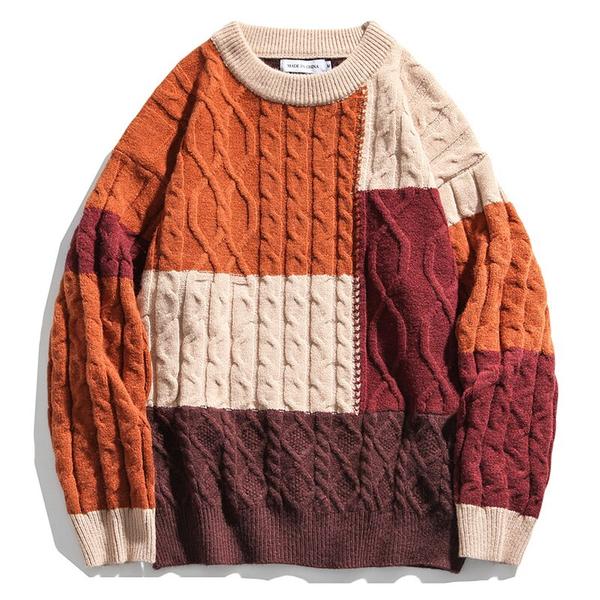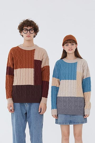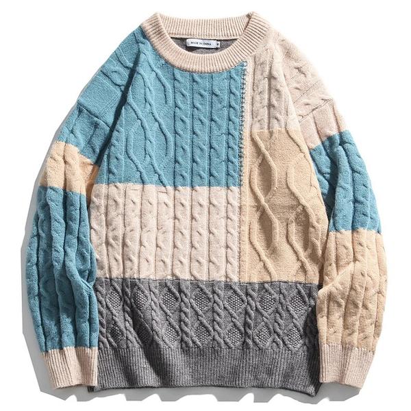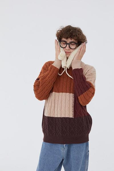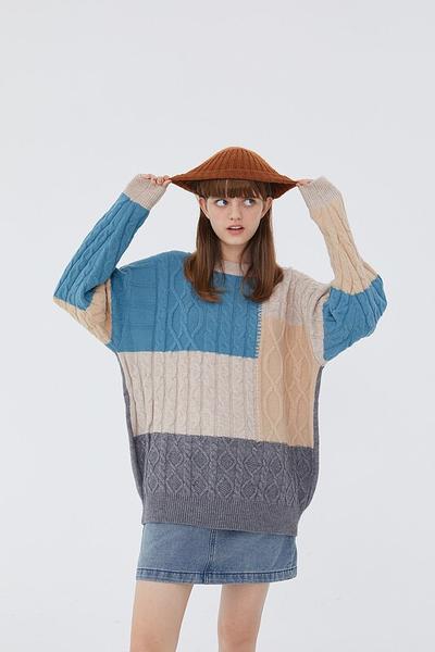 Oversized cable knit sweater featuring allover colour block pattern, dropped long sleeves and ribbed trim.