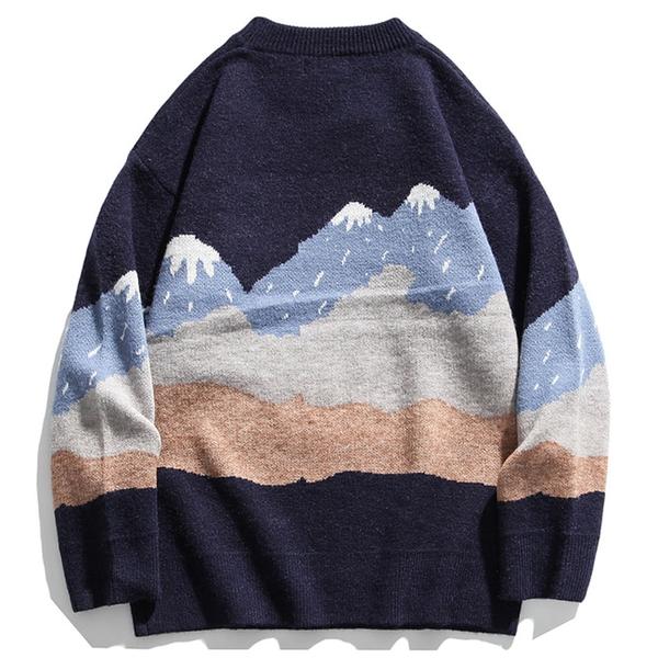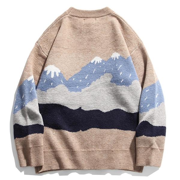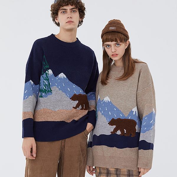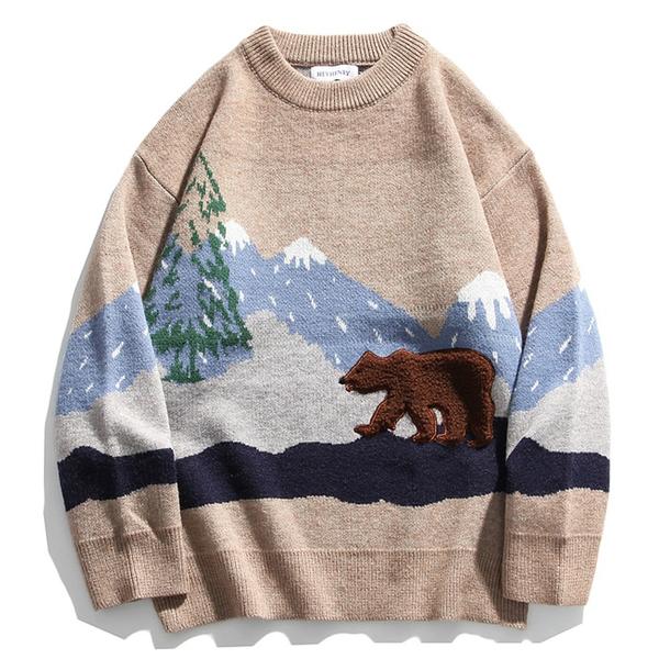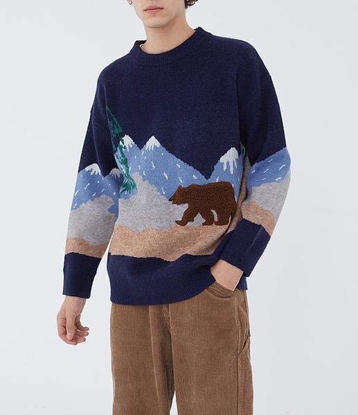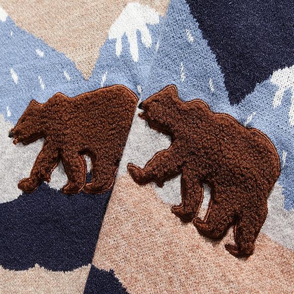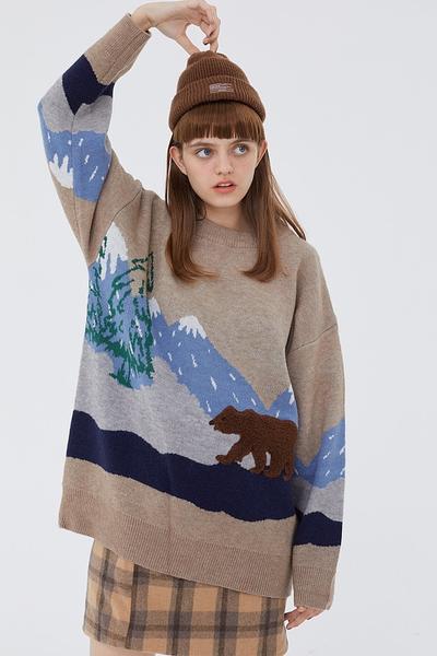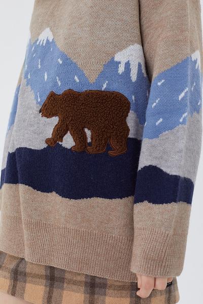 Oversized knit sweater featuring allover snow mountain & embroidered bear pattern, dropped long sleeves and ribbed trim.