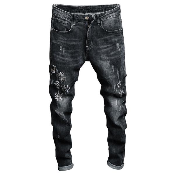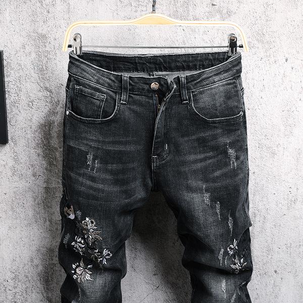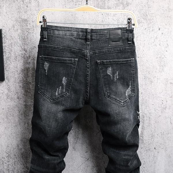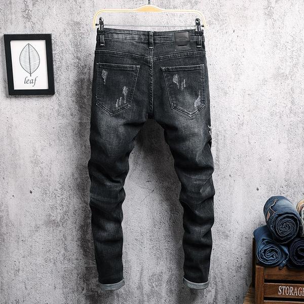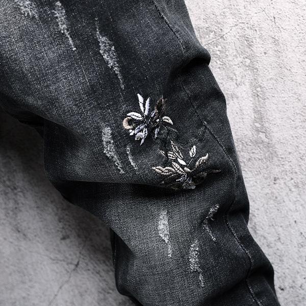 - Skinny Ripped Letters Detail Tapered Jeans - Faded Black