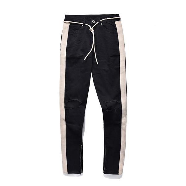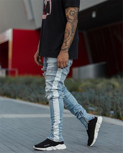 - Dark Blue Ripped Skinny Side Stripe & Ankle Zipper Jeans