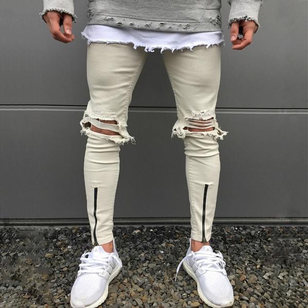 - Khaki Skinny Knee Ripped Ankle Zipper Jeans