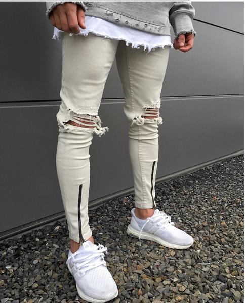 - White Skinny Knee Ripped Ankle Zipper Jeans