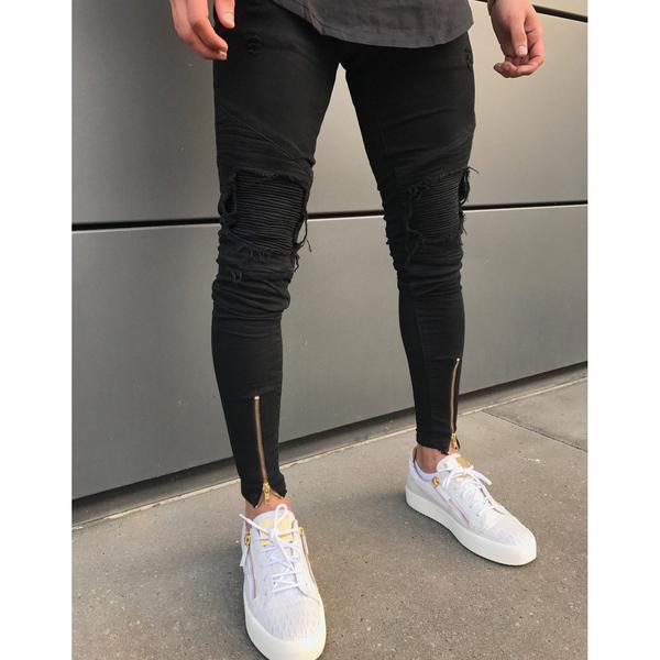 - Premium Ripped Ankle Zipper Black Biker Jeans